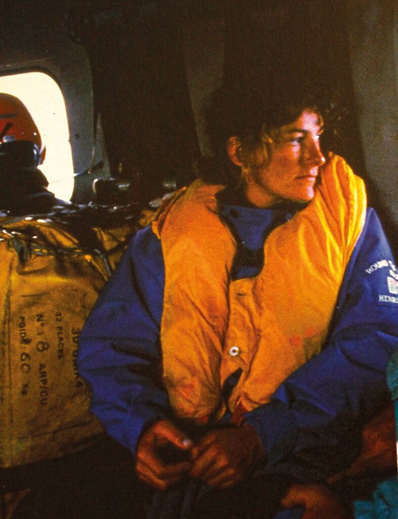 1988 kentert sie mit ihrem Trimaran. Sie und ihre Crew werden mit dem Helikopter gerettet.