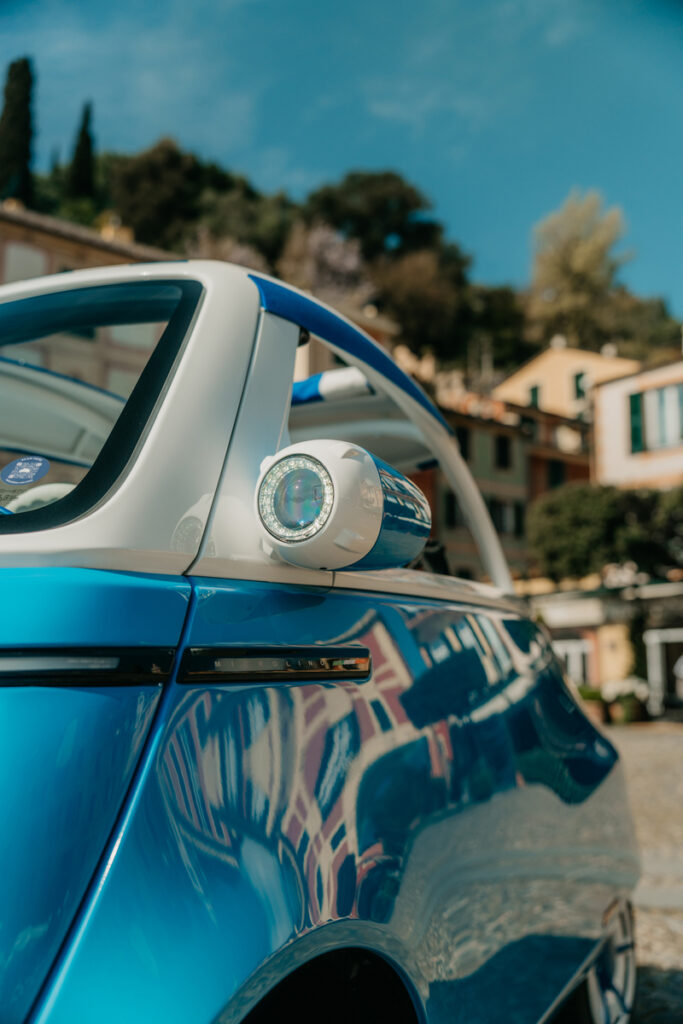 Das auffälligste Detail ist ihr Design ohne Seiten- und Heckfenster. Stattdessen entsteht ein luftiges Fahrgefühl, verstärkt durch ein Canvas-Dach, das sich zurückrollen oder komplett abnehmen lässt. Damit wird aus dem City-Flitzer ein echtes Cabriolet für die kurze Auszeit vom Alltag. Zwei Farbvarianten stehen zur Auswahl: Portofino Blue, ein helles Blau mit weissen Akzenten, das sofort an die Riviera erinnert, und Sardinia Sage, ein mattes Grün mit schwarzen Details, inspiriert von mediterranen Landschaften. Im Innenraum wartet eine Ausstattung aus feuchtigkeitsresistentem, yacht-inspiriertem veganem Leder, abgestimmt auf das Dolce-Vita-Konzept und das offene Lebensgefühl, das der Spiaggina verkörpert.