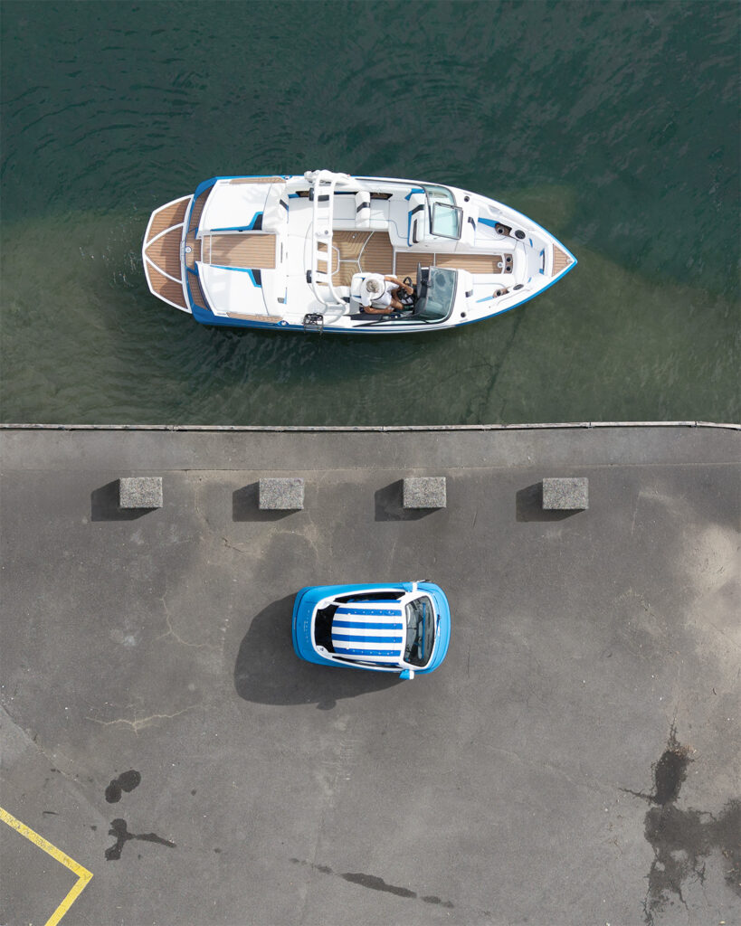 Die Spiaggina ist nicht nur Auto, sie ist ein Statement. Besonders deutlich wird das, wenn man sie neben ein Boot in passendem Look stellt. Ein Modell in weiss-blauer Farbgebung, wie im Bild gezeigt, wirkt wie der Zwilling auf dem Wasser. Beide teilen dasselbe Designverständnis: leicht, offen, frei. Ob auf dem See, dem Meer oder der Promenade, es geht immer um das Lebensgefühl von Sommer, Sonne und Freiheit.