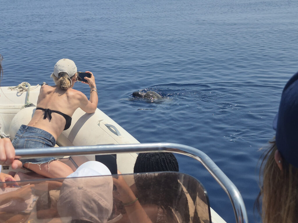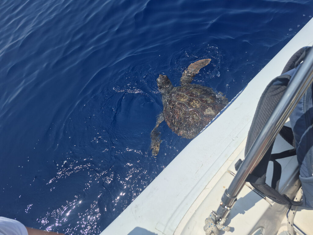Fischer haben heute zwei verletzte Schildkröten an die Station gebracht. Die in Not geratenen Tiere bekommen sofort einen Namen: Pablo und Jenny. Bevor wir etwas über den Ablauf der Woche erfahren, werden die Schildkröten versorgt. Klare Ansage – die Bedürfnisse der Tiere kommen vor denen der Menschen. Wir lernen bereits das Wichtigste über die lokalen Meerestiere, ihre Erkennungsmerkmale und die Gefahren durch die Fischerei. Schliesslich geht es morgen gleich auf den ersten Einsatz. Ich lerne, dass die Schildkröten caretta caretta (unechte Karettschildkröte) heissen, es verschiedene Delfinarten gibt und wir – wenn wir Glück haben – capodogli (Pottwale) sehen werden.