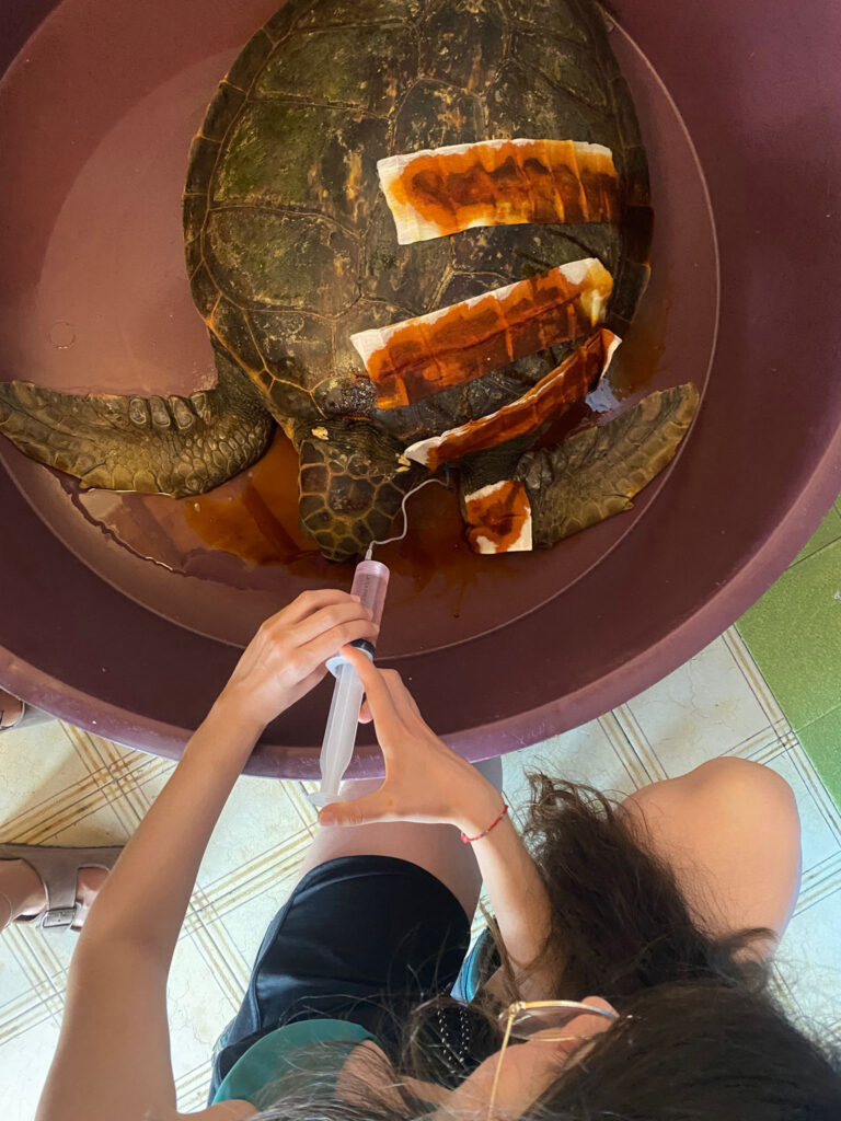 Der Tag beginnt mit schlechten Nachrichten. Um 9 Uhr stellen wir fest, dass eine Schildkröte die Nacht nicht überlebt hat. Sie war in die Notaufnahme gekommen, weil sie einen Angelhaken verschluckt hatte. Anscheinend hat sie sich von den inneren Verletzungen nicht erholt. Die Trauer um das tote Tier schweisst uns als Gruppe spontan zusammen.