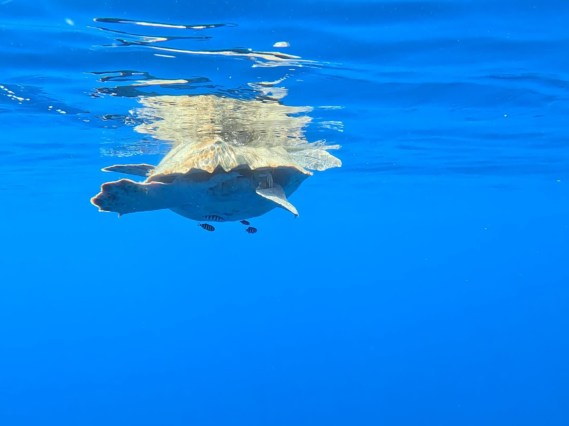 Ab jetzt schauen wir aufs Meer. Seestärke Null – Windstärke Null. Perfekte Bedingungen für Übersicht und Weitsicht beim täglichen Monitoring. Während alle konzentriert aufs Wasser gucken, hören unsere Ohren Infos über Gattungen, Erkennungsmerkmale und Verhalten von den einheimischen Fischen, Vögeln, Krabben oder Quallen. Vittoria und Monica wissen viel und teilen sich begeistert mit. Wonach wir Ausschau halten? Nach allem, was schwimmt und sich bewegt. Und alle 10 Minuten dokumentieren wir Position und Sichtung. Wir sammeln Müll, der Schildkröten gefährlich werden kann: herrenlose Netze und Fischereimaterial, Angelhaken, Styropor, Fasern, Plastik. Das Boot füllt sich.