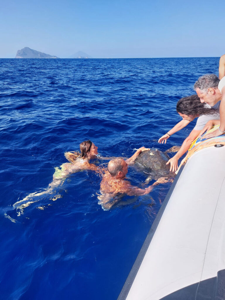 Um 9:00 Uhr wird täglich der Zustand der Schildkröten analysiert und über die Behandlungen gesprochen. Mafalda schwimmt immer noch schief. Sie soll nach Lipari zum Röntgen bei der Tierärztin. Also! Alle Mann an Bord – auch Mafalda – und Kurs auf Lipari.